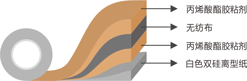 ? 采用柔軟無紡布作為基材,涂敷優(yōu)異的丙烯酸酯膠粘劑,制成的無紡布雙面膠帶。